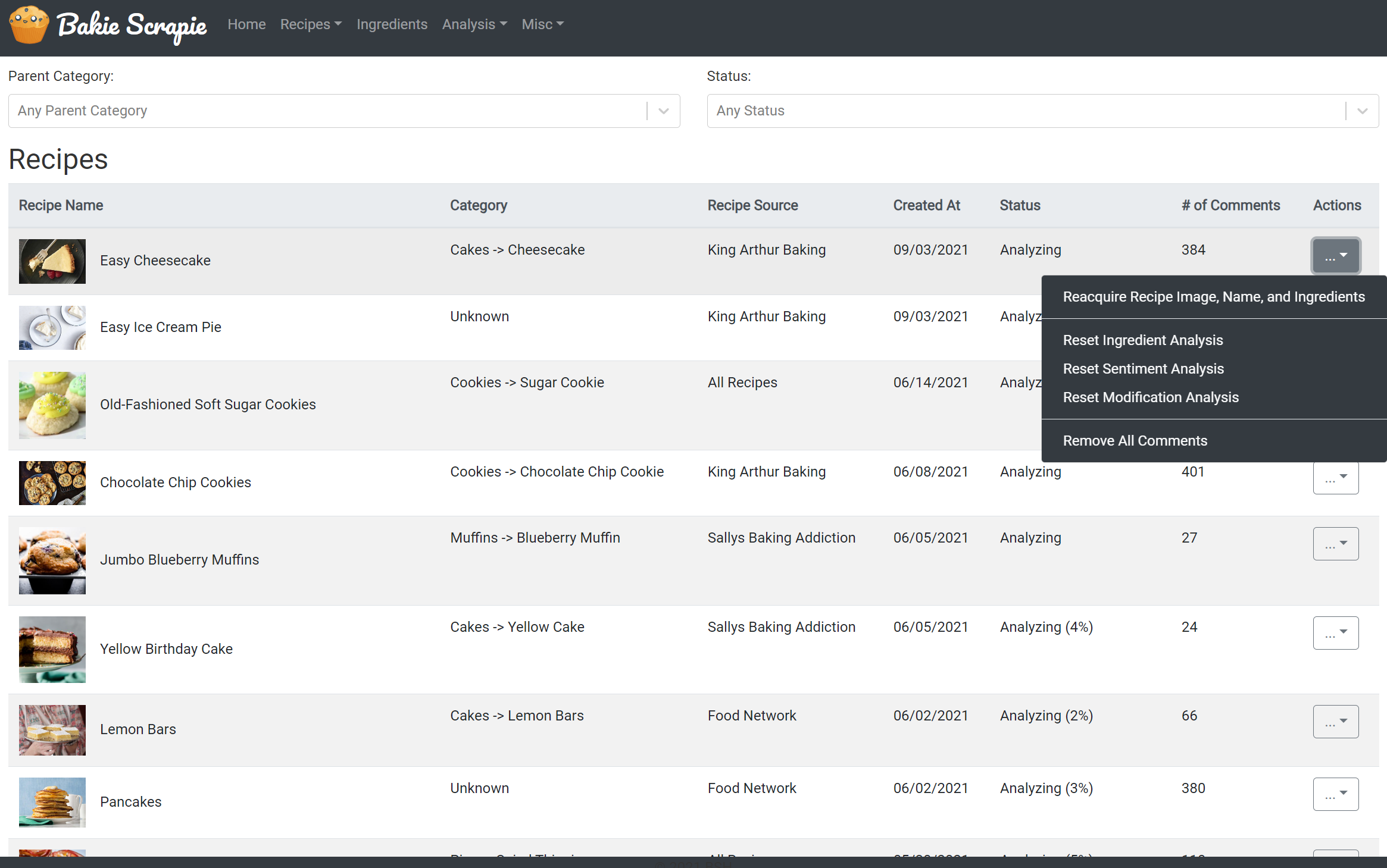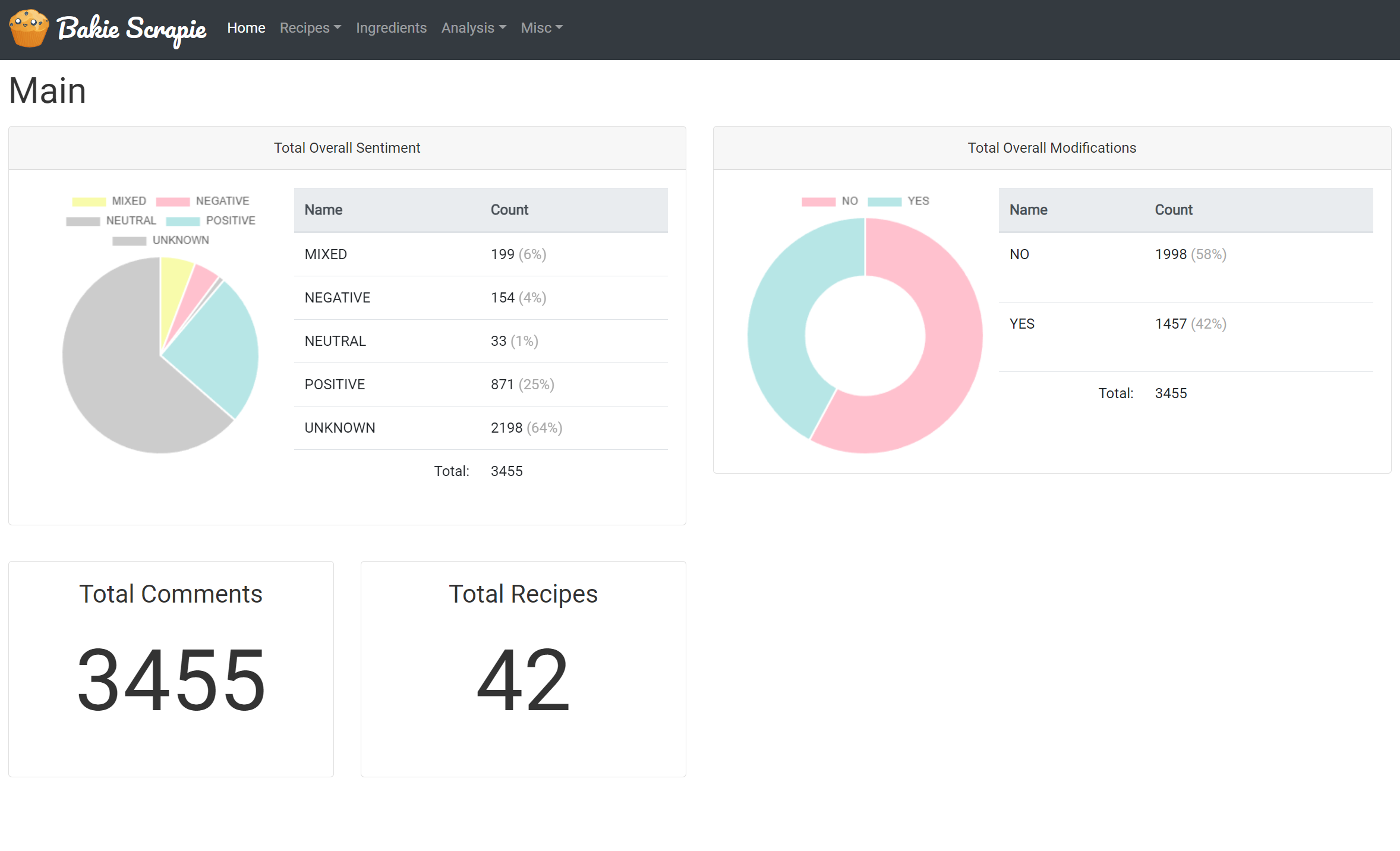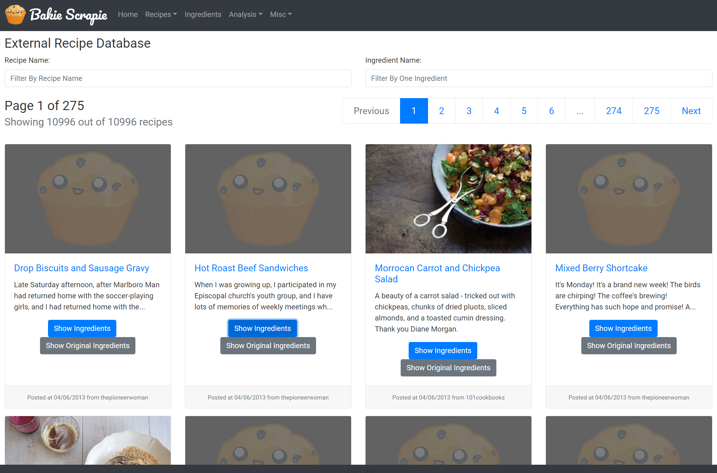 Bakie Scrapie's objective was to determine how many people enjoyed a posted recipe on a recipe blog site and what kind of modifications they made to the recipe. The goal was to eventually feed this data into a machine learning dataset so another recipe app could suggest favorable alterations to recipes it detected the user was putting together.