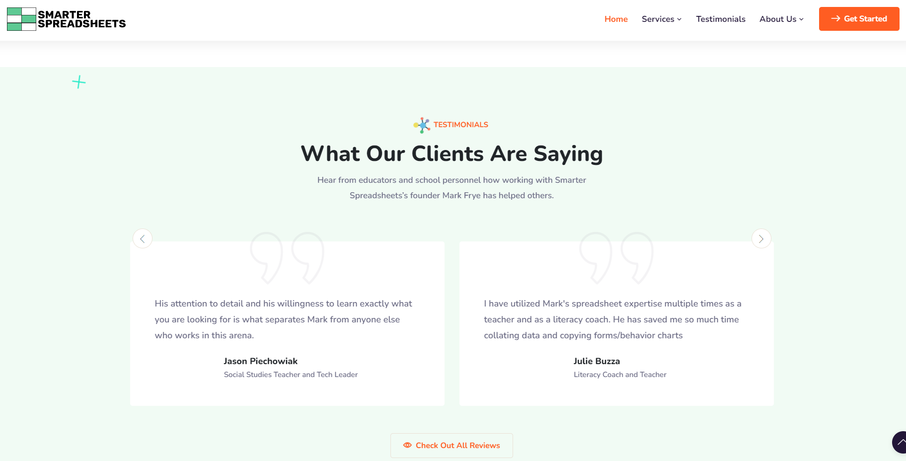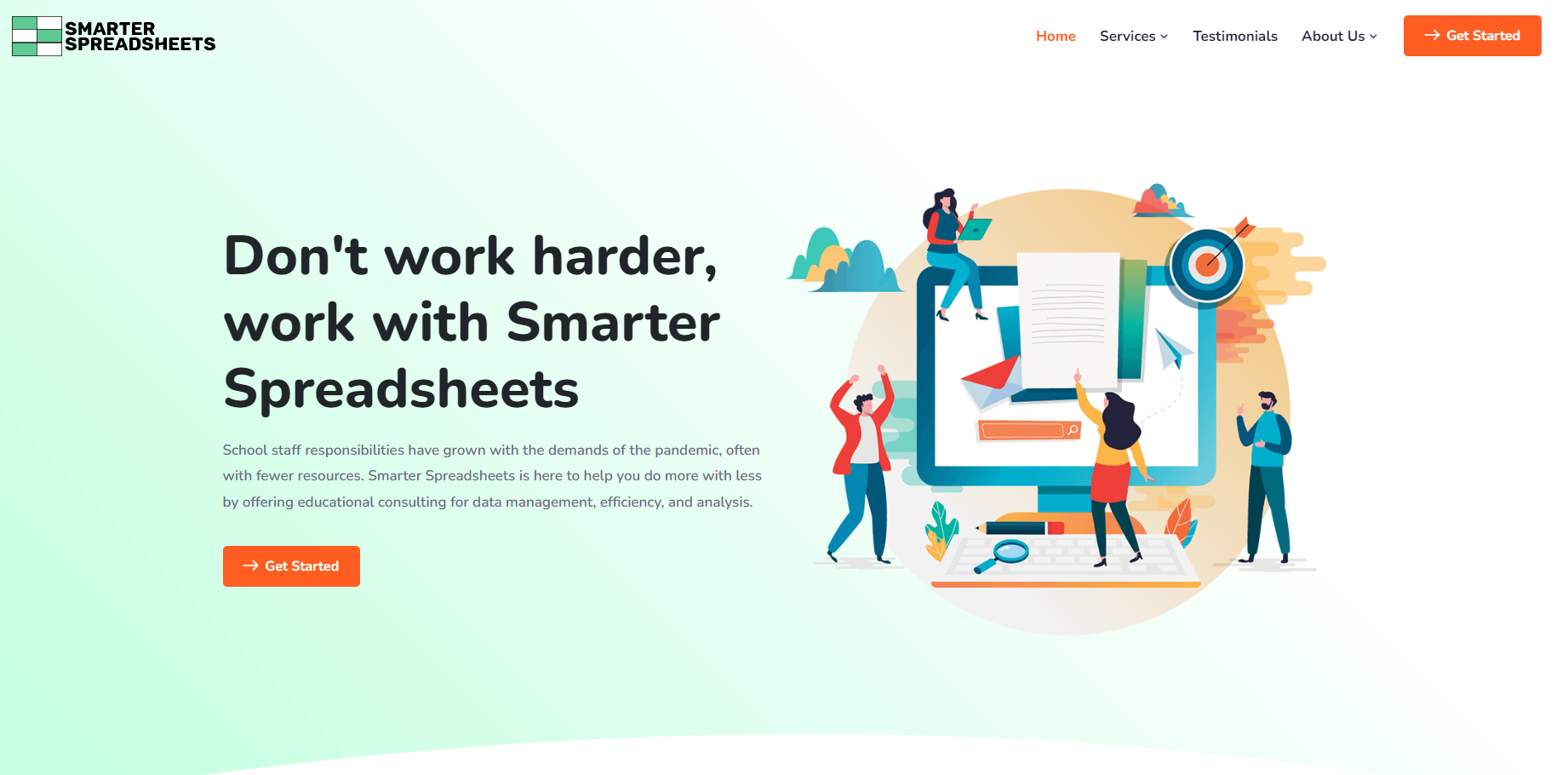 Smarter-Spreadsheets' objective was to create a web presence for a former educator who wanted to alleviate the data responsibilities on school staff by providing a resource to help them do more with less. Smarter-Spreadsheets offers consulting for data management, improving efficiencies, and providing data analysis.
